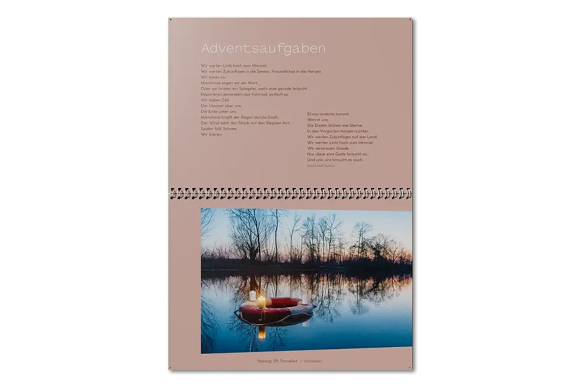 Der Andere Advent bietet Nachdenkliches, Augenzwinkerndes und Überraschendes vom Vorabend des Ersten Advent bis zum 6. Januar. Er erscheint zum 31. Mal und ist der auflagenstärkste Adventskalender im deutschsprachigen Raum. In diesem Jahr reicht die Autorenmischung von Joachim Meyerhoff, Julia Engelmann, Fulbert Steffensky und Bruce Springsteen bis hin zu bislang unentdeckten Verfasserinnen. Vertieft werden die Impulse durch Bilder von ausgewählten Fotografen.