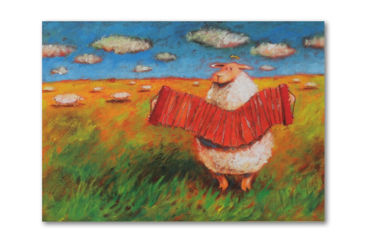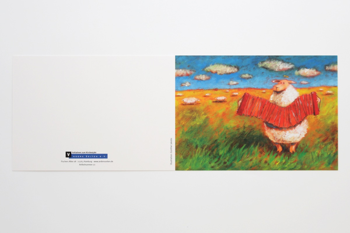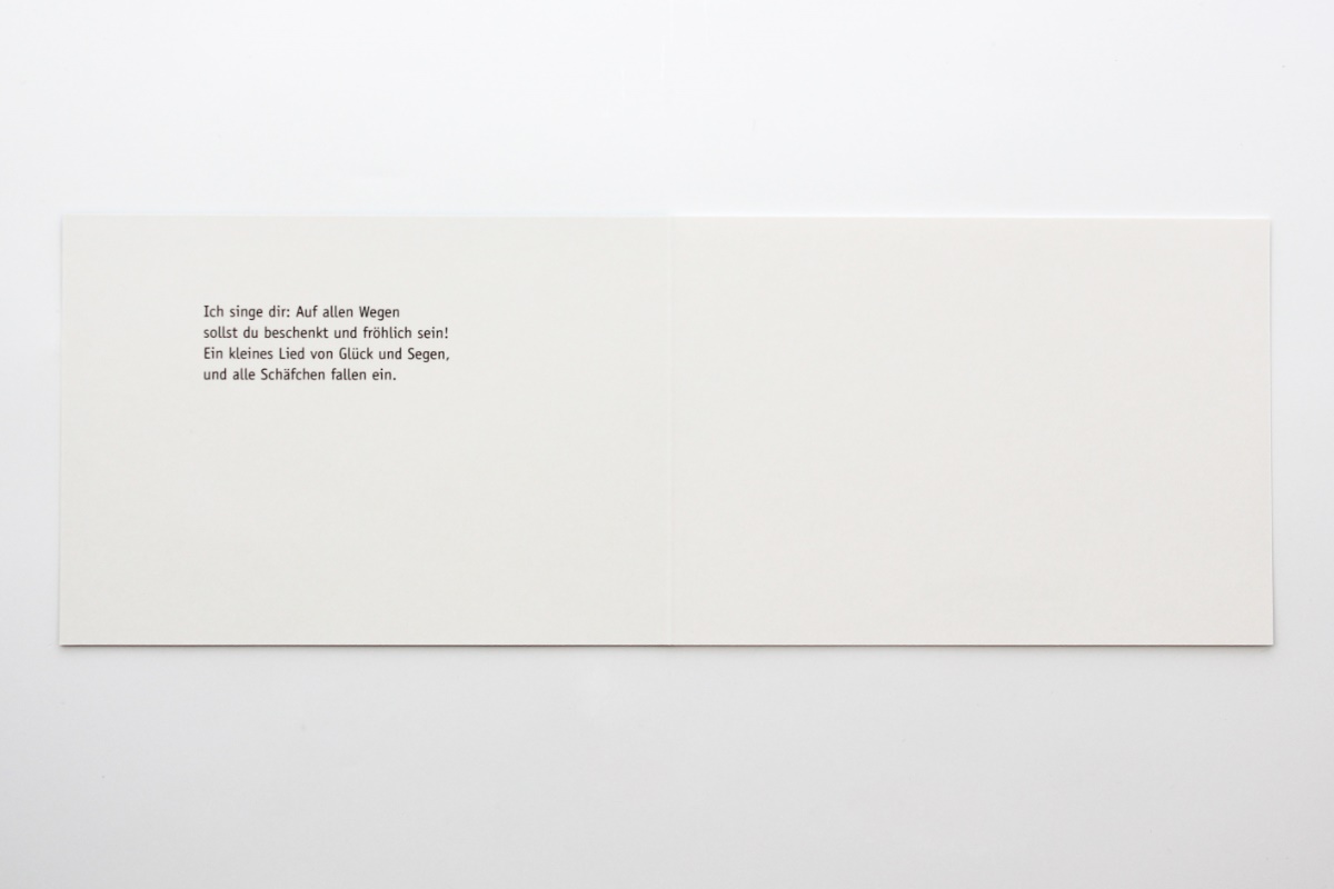 Text der Karteninnenseite: Ich singe dir: Auf allen Wegen sollst du beschenkt und fröhlich sein! Ein kleines Lied von Glück und Segen, und alle Schäfchen fallen ein.