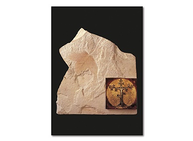 Kunst-Doppelkarte Ikone Lebensbaum auf Stein mit fossilem Blatt 1979 DIN A6 (14.8x10.5 cm)