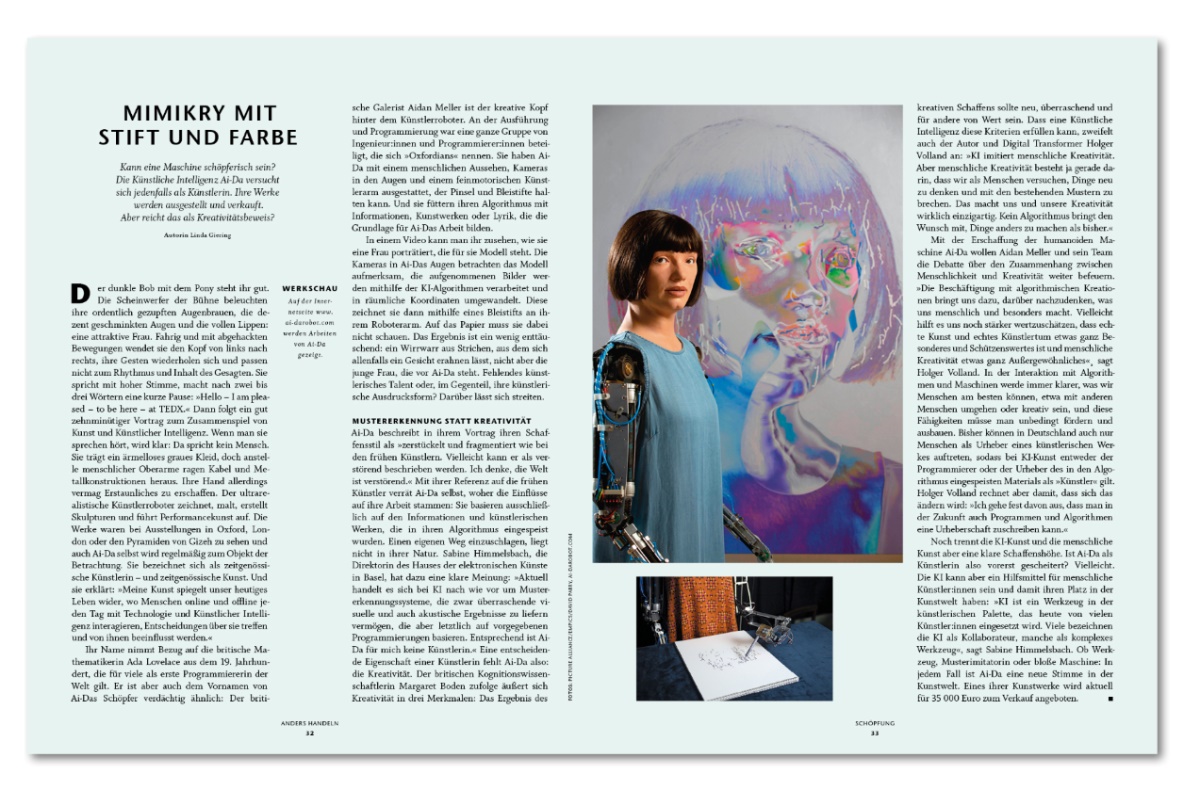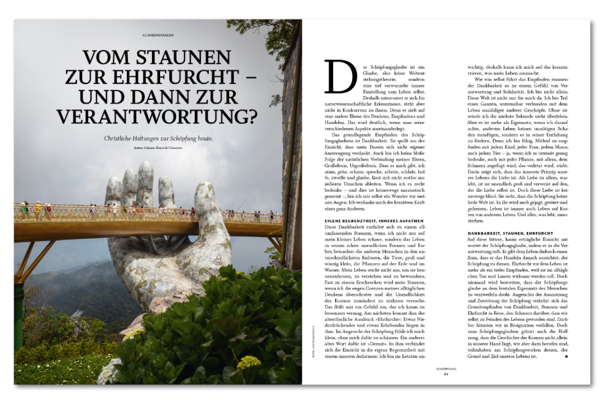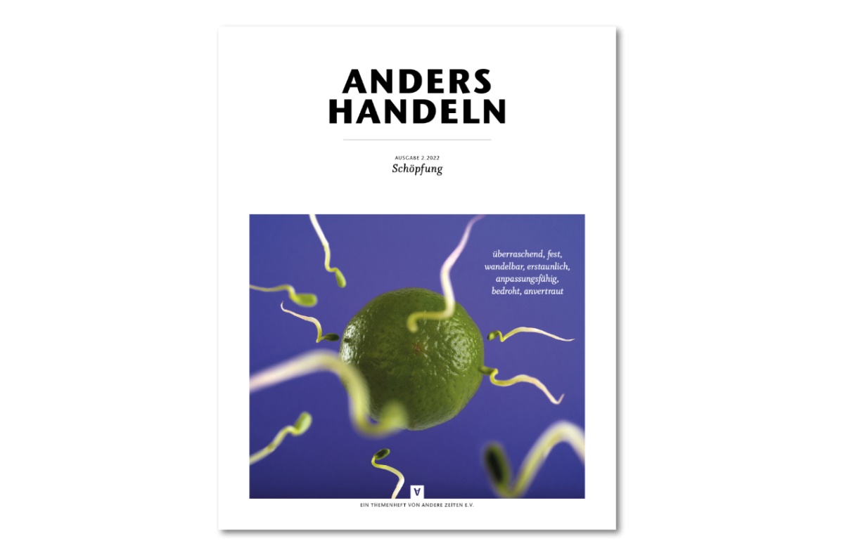 Wir beleuchten auch die tragische Seite der Schöpfung, die menschliche Unfähigkeit, sich zur Schöpfung zu verhalten und sie nicht nur als Ressource zu verstehen. Wir haben mit dem Soziologen Harald Welzer über notwendige Veränderungen gesprochen, mit einer Anwältin, die für den Schutz unserer Lebensgrundlagen streitet, mit einer Meteorologin, ob der Klimawandel mit Geoengineering abgemildert werden kann, mit Theolog:innen über hilfreiche Paradiesvorstellungen. Wir stellen Naheliegendes und Ungewöhnliches vor – die Bekenntnisse eines Hobbygärtners und die Lego-Welt eines Jugendlichen genauso wie die Werke einer Künstlichen Intelligenz und die Arbeit eines Papierschöpfers, der mit traumatisierten Menschen arbeitet. Und wie beim Anglerfisch im tiefschwarzen Meer gilt auch hier: Das Staunen über das Licht in der Finsternis überwiegt. Denn da fällt es besonders auf.